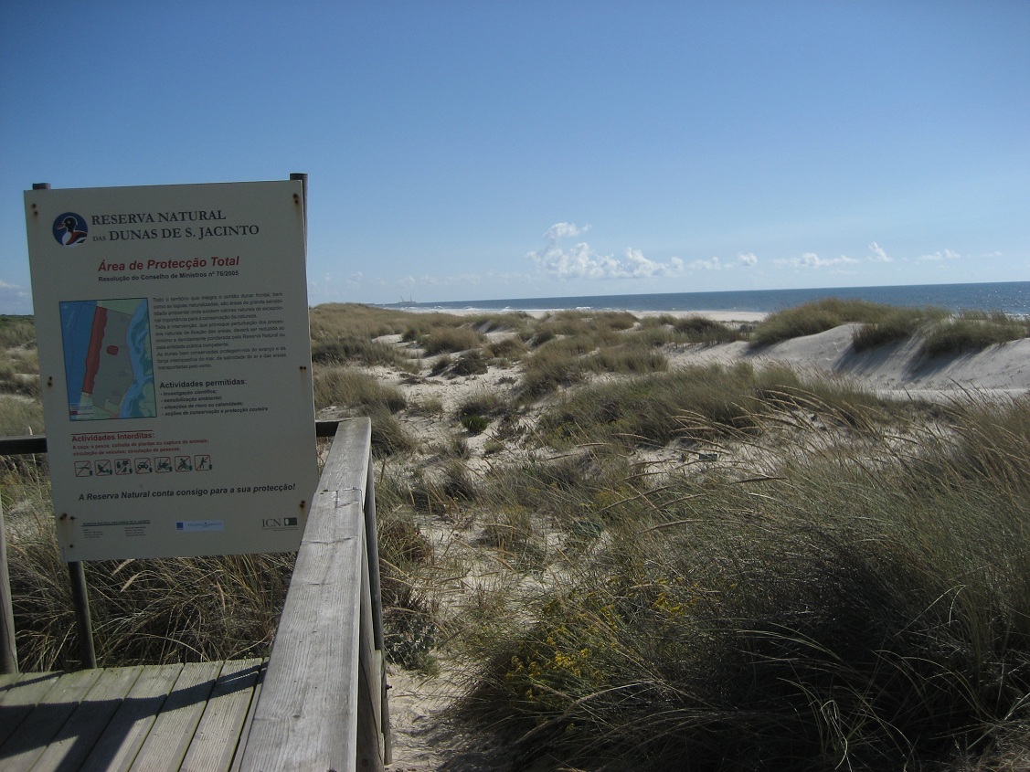 La Reserva Natural la Dunas de San Jacinto está situada en una lengüeta de arena que se extiende entre el brazo norte de la Ría de Aveiro y el Atlántico, ocupando aproximadamente unas 666 ha.